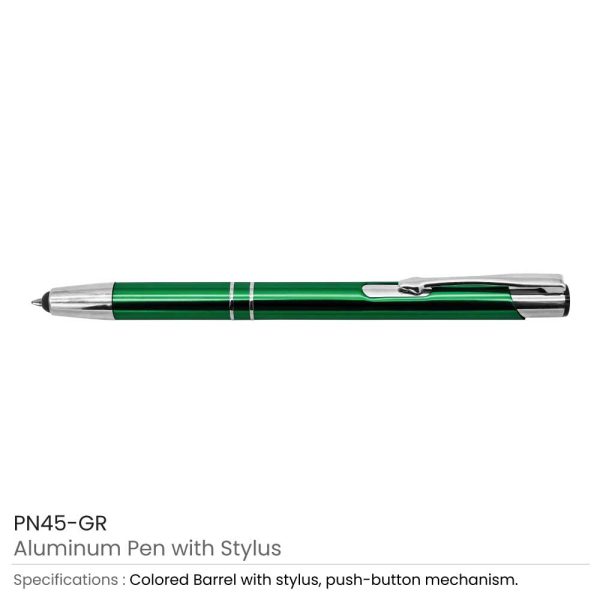Introducing to you our aluminum pens with a stylus. It performs two different functions. It has been created with aluminum material. This multi-functional pen comprises a colorful metal barrel. This metal barrel comes in five different colors. The colors include black, green, silver, blue, and red. Apart from the barrel, it comprises a silver tip and clip. Thus, itโ€™s a perfect branded pen for companies. The silver clip at the end of the pen works like a holder. Thus, you can attach the pen to your shirt or bag. ย This stylish metal pen also comprises a stylus so you can use it on your smartphones. It comes with a push-button mechanism. So, you can easily switch between the ball pen and stylus.